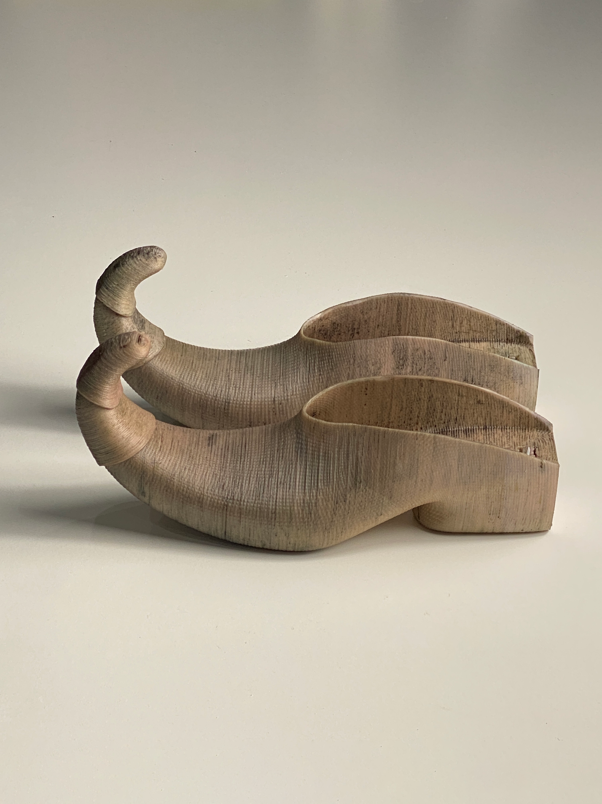 Curled toe mules inspired by medieval Polaines, designed by Lueder in collaboration with Body Amplification Devices.
