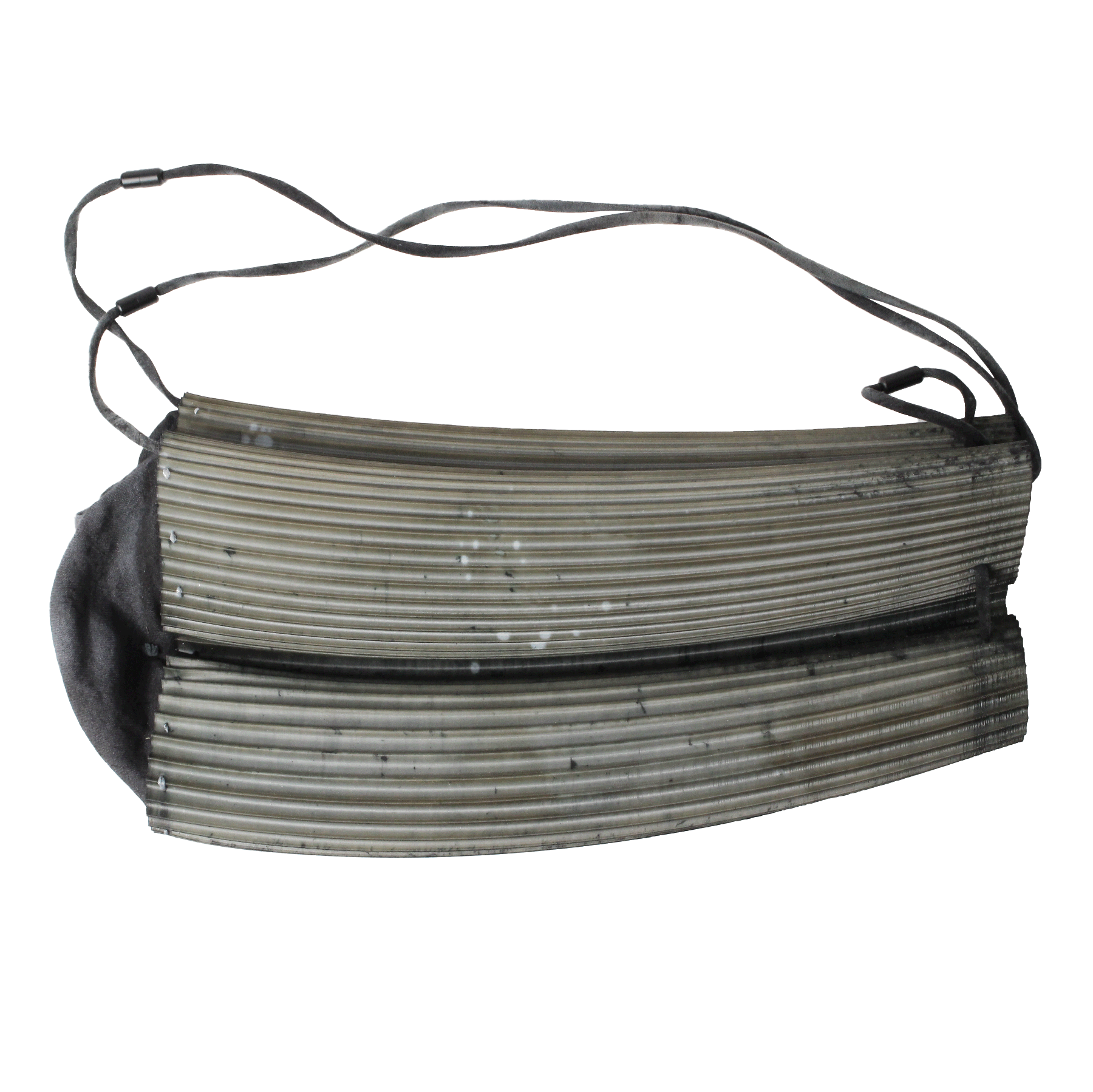 Rubber Bag. Its geometry allows for expandability. The main body of the bag is made from a fully recyclable and highly flexible polyurethane rubber. The bottom of the bag is made from upcycled denim sourced in London. The main body is 3D printed, which significantly reduces material use when compared to traditional injection-moulding. Small deffects and punctuations in the prints are normal and unavoidable when 3D printing, they contribute to the aesthetic of the product.